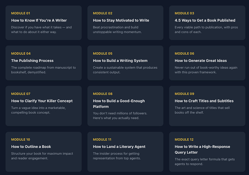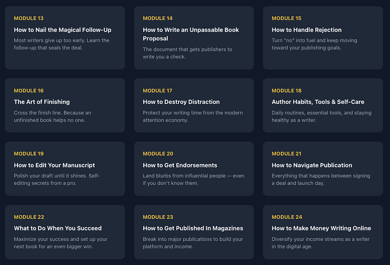 A deep-dive into insider author tactics that most writers never learn. Here’s exactly what you’ll master: